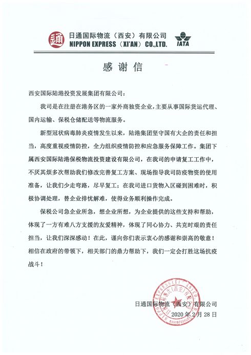 新型冠状病毒肺炎疫情发生以来,陆港集团坚守国有大企的责任和担当,高度重视疫情防控,积极协调企业需求,全力组织疫情防控和应急服务保障工作。最近,陆港集团收到了一份特别而又珍贵的“礼物”——来自日通国际物流(西安)有限公司的一封感谢信和一面锦旗。
